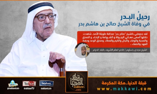 وإن فقيدَنا بالأمس يعزّ علينا نعْيُه، وفقْدهُ يَثقُل علينا سمْعُه، قتَل الحزنُ على فراقهِ قلوبَنا، وهيْمن الكمدُ برحيله على نفوسنا، إنه سعادة الشيخ صالح بن هاشم بدر، أحد وجهاءِ ورجال أعمال العاصمة المقدسة، أسكنه الله في عليين، ورزقه شفاعة سيد المرسلين، ورحمه رحمة الأبرار الصالحين.