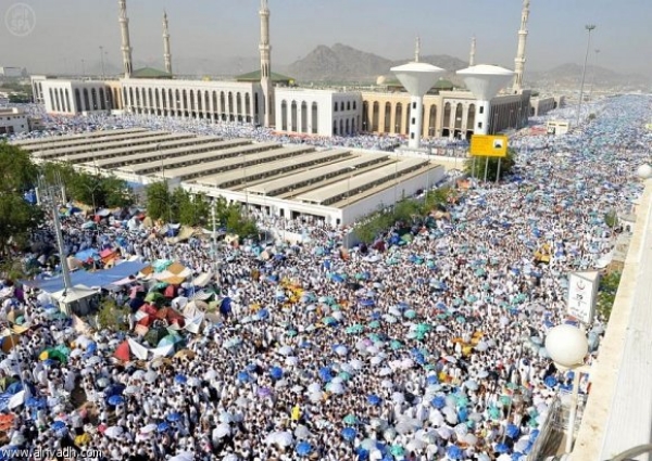 كما امتلأت جنبات المسجد الذي تبلغ مساحته 110 آلاف متر مربع والساحات المحيطة به التي تبلغ مساحتها ثمانية آلاف متر مربع بضيوف الرحمن، وتقدم المصلين أمير منطقة مكة المكرمة رئيس لجنة الحج المركزية صاحب السمو الأمير خالد الفيصل، فيما أم المصلين مفتى عام المملكة الشيخ عبدالعزيز بن عبد الله آل الشيخ بعد أن ألقى خطبة عرفة التي استهلها بحمد الله والثناء عليه على ما أفاء به من نعم ومنها الاجتماع العظيم على صعيد عرفات الطاهر.