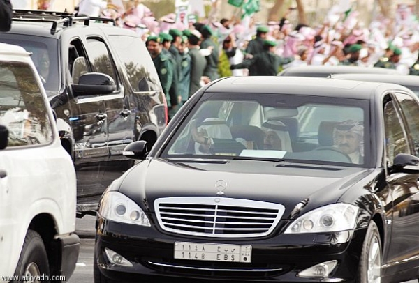 خادم الحرمين يلوح بيده محيياً المواطنين الذين قدموا للتعبير عن بهجتهم.