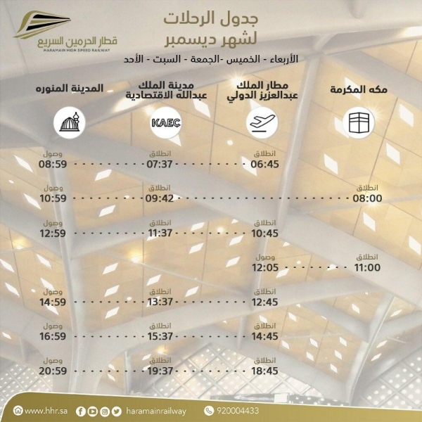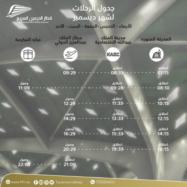 تشغيل رحلات قطار الحرمين السريع - بمشيئة الله تعالى - إلى مكة المكرمة بعد غدٍ الأربعاء، وذلك بعد إنجاز مشروع "تحويل المسار السككي البديل"