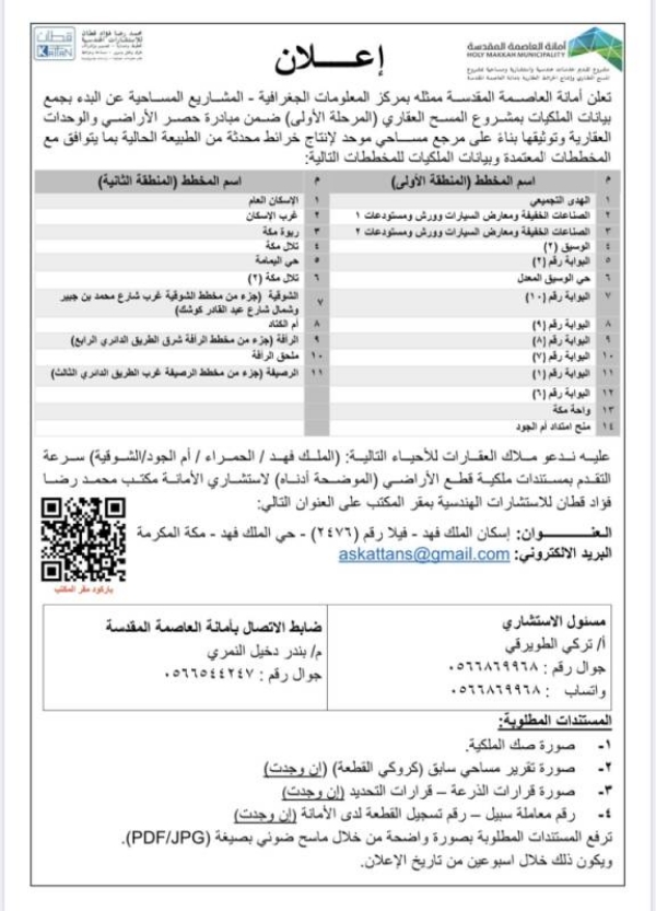 وأهابت أمانة مكة بملاك العقارات للأحياء التالية: (الملك فهد والحمراء وأم الجود والشوقية)، سرعة التقدم بمستندات ملكية قِطَع الأراضي لاستشاري مكتب محمد رضا فؤاد قطان للاستشارات الهندسية بمقر المكتب بحي إسكان الملك فهد.
