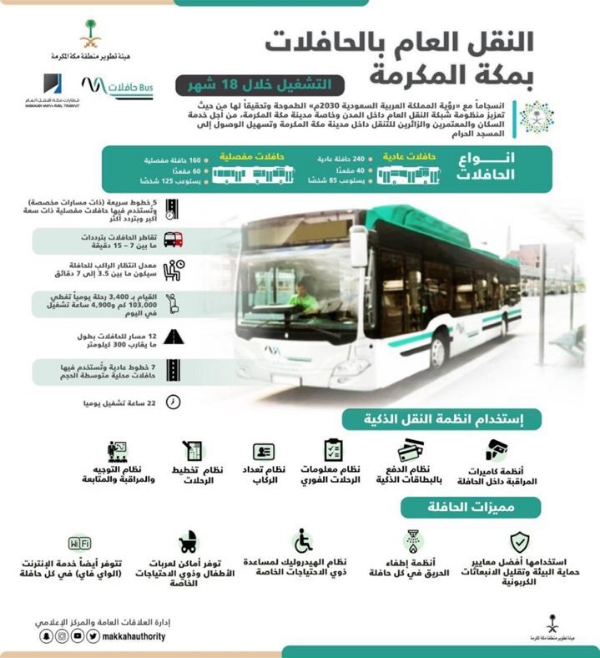 من جانبها، أوضحت هيئة تطوير منطقة مكة المكرمة أن مشروع النقل العام بمدينة مكة المكرمة يتكون من 400 حافلة، ويشمل المشروع إنشاء المحطات الرئيسية للحافلات ومحطات التوقف لأكثر من 500 محطة ومواقف مظللة وموزعة على شبكة طرق تزيد أطوالها على 300 كلم، إضافة إلى تهيئة وتجهيز 12 مسارا وتمييزها كمسارات مخصصة للحافلات، لسهولة وسرعة التنقل وتحقيق جودة وكفاءة الخدمة المطلوبة مع إنشاء عدد 7 جسور للمشاة لعبور الشوارع الرئيسية والتنقل بين المحطات، مجهزة بالمصاعد الكهربائية لخدمة كبار السن وذوي الاحتياجات الخاصة، إضافة إلى تنفيذ أنظمة وأجهزة النقل الذكية بالحافلات والتحكم بالإشارات المرورية وإشارات المشاة.