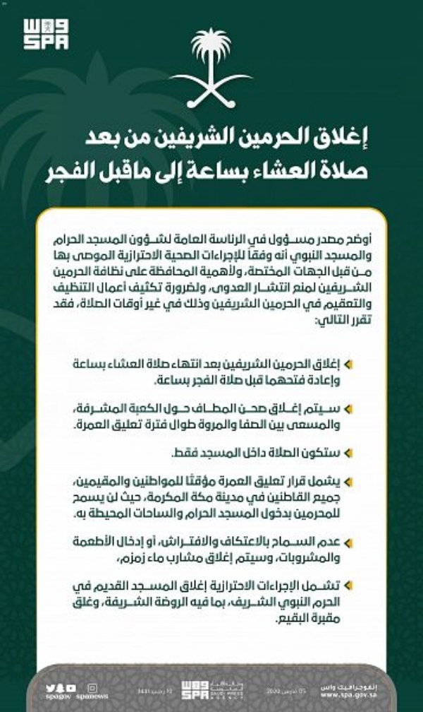 أوضح مصدر مسؤول في الرئاسة العامة لشؤون المسجد الحرام والمسجد النبوي، أنه وفقاً للإجراءات الصحية الاحترازية الموصى بها من قبل الجهات المختصة، ولأهمية المحافظة على نظافة الحرمين الشريفين لمنع انتشار العدوى، ولضرورة تكثيف أعمال التنظيف والتعقيم في الحرمين الشريفين وذلك في غير أوقات الصلاة، فقد تقرر إغلاق الحرمين الشريفين بعد انتهاء صلاة العشاء بساعة وإعادة فتحهما قبل صلاة الفجر بساعة. كما أنه سيتم إغلاق صحن المطاف حول الكعبة المشرفة، والمسعى بين الصفا والمروة طوال فترة تعليق العمرة، وستكون الصلاة داخل المسجد فقط.