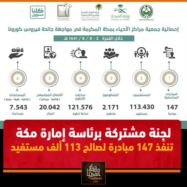 نفذت لجنة مشتركة برئاسة إمارة منطقة مكة المكرمة، وضمت وزارة الصحة وجمعية مراكز الأحياء والموارد البشرية والخدمة الاجتماعية؛ أكثر من 147 مبادرة مجتمعية لمواجهة جائحة فيروس كورونا.
