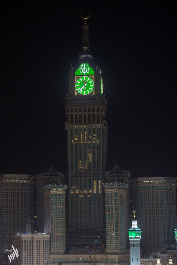 "خلك في البيت" تزين برج الساعة بمكة لتشجيع البقاء في المنازل
