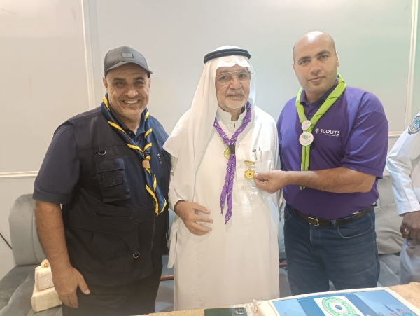 رواد الكشافة العرب يقلدون المطوف فؤاد كاتب الوسام الذهبي ومنديل المرحوم بندر العبيدي كاول شخصية تحصل عليهما